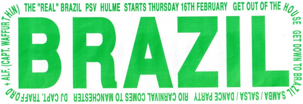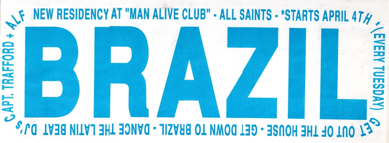 My brother was DJing the Brazil nights with Trafford, but for some reason, I was quite happy pottering around behind the scenes, cobbling together flyers, discussing logistics, finding potential tunes, dragging all my friends along to support the nights, and generally taking a back seat. Why was that?
