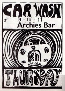 Trafford was determined to use posters to publicise CarWash because he thought Brazil had suffered due to relying on flyers. He took a DIY approach to save money, making posters using A0 sheets of paper, car spray and stencils; the design included a cartoon of his vintage Morris Oxford car! He and Alf then embarked upon a ninja-style fly-posting operation. Sadly I have no photos of the posters, but I have found an ad from City Life, advertising Carwash at ‘Archies Bar’ (now The Thirsty Scholar under the arch where New Wakefield Street meets Oxford Road.)