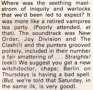 A short write-up in City Life Issue 8 (April 1984), again from Mick & Dean, reveals that The Berlin’s Thursday ‘Private Road’ night was intended to be a Punk/Goth night, but I don’t think I took this on-board when I went there: