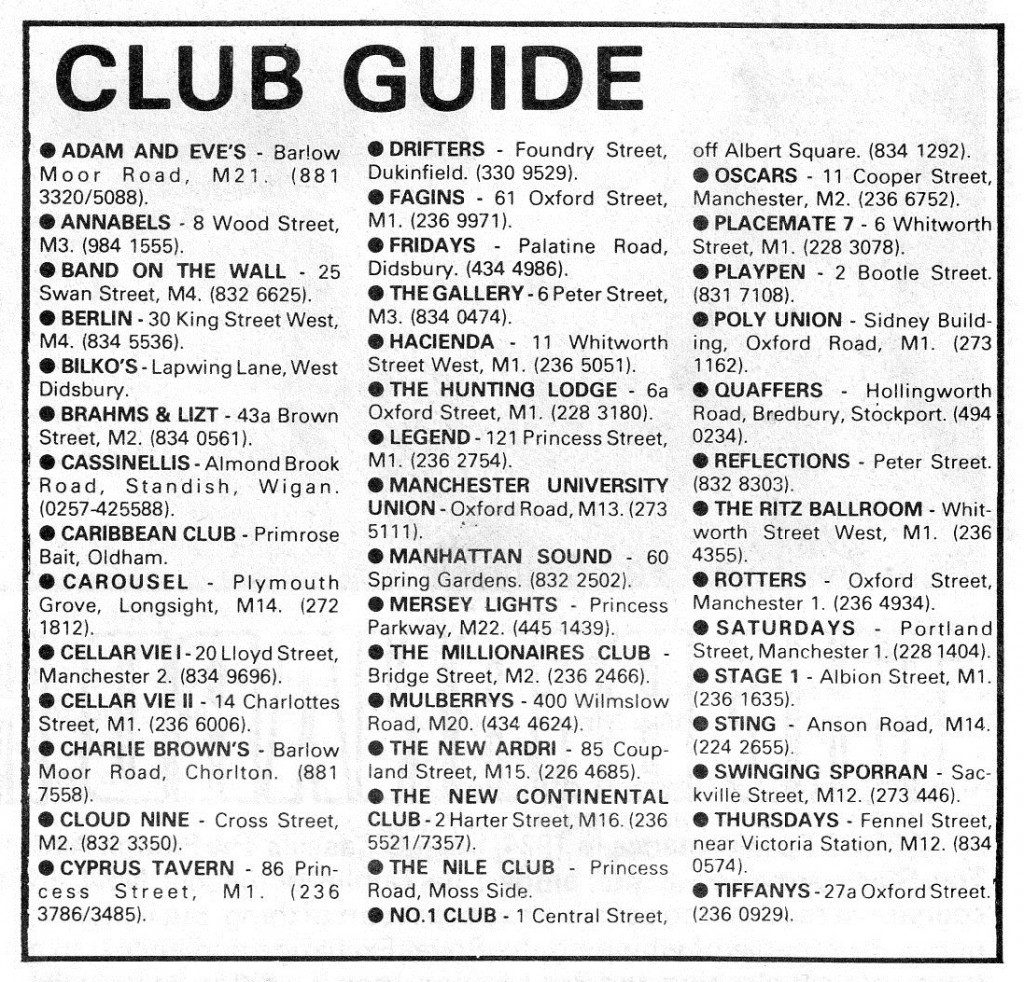 Here is a copy of the club list printed in City Life Issue 3 (Jan-Feb 1984):