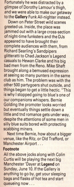 Meanwhile, the Legend club listed in 1984 is the club on Princess Street, which was renamed 5th Avenue. Legend opened in 1980 with a state of the art sound and lighting rig installed, but this was wasted on me at the time; I assumed the place was a 70s relic because it was very much a ‘discotheque’. It’s the location of the Happy Mondays’ video for WFL which can be seen here.