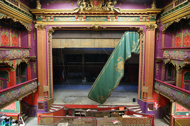 Very sadly, the interior of the main theatre is in a state of chronic disrepair, due to lead tiles having been stolen from the roof. Daylight is visible backstage and the paintwork is peeling dramatically due to the damp. I have been told that the council and the universities are keen to save the theatre building but are unwilling to enter any partnership with the owners, following accusations of child trafficking.