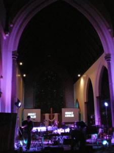 The venue was a revelation. I’ve been to St Clement’s Church Hall before but I never realised that one of the walls can fold back to reveal the interior of the church itself. This provided the perfect set for Sisters of Transisitors in their shiny vestment-like capes… looking like the high priest and priestesses of a kitsch cult sixties film.